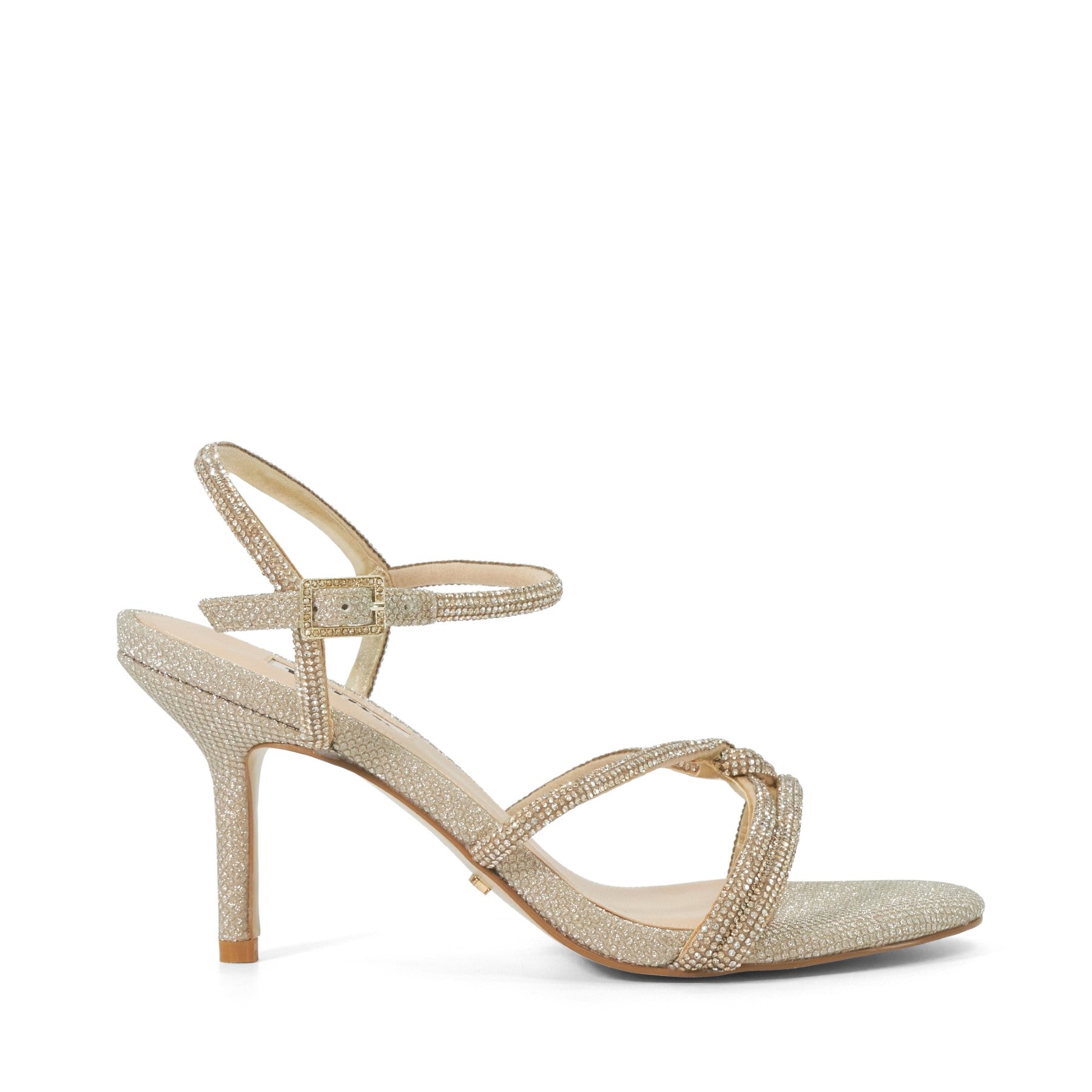 Made exclusively in collaboration with Brit designer Joanne Stoker. Features cut out sides and peep toe with skinny buckled ankle strap. Metallic details and neon piping give a colour pop to this summer design.