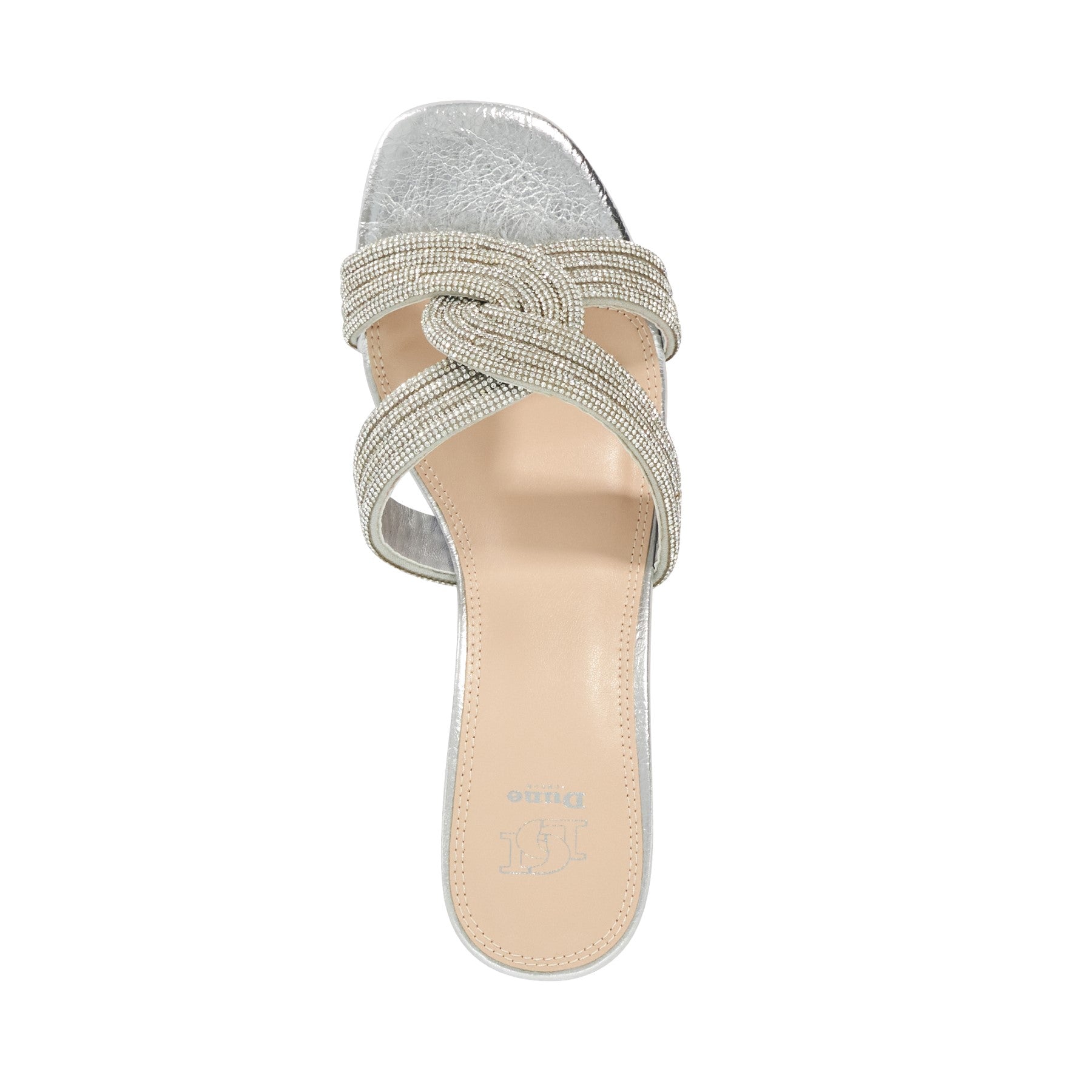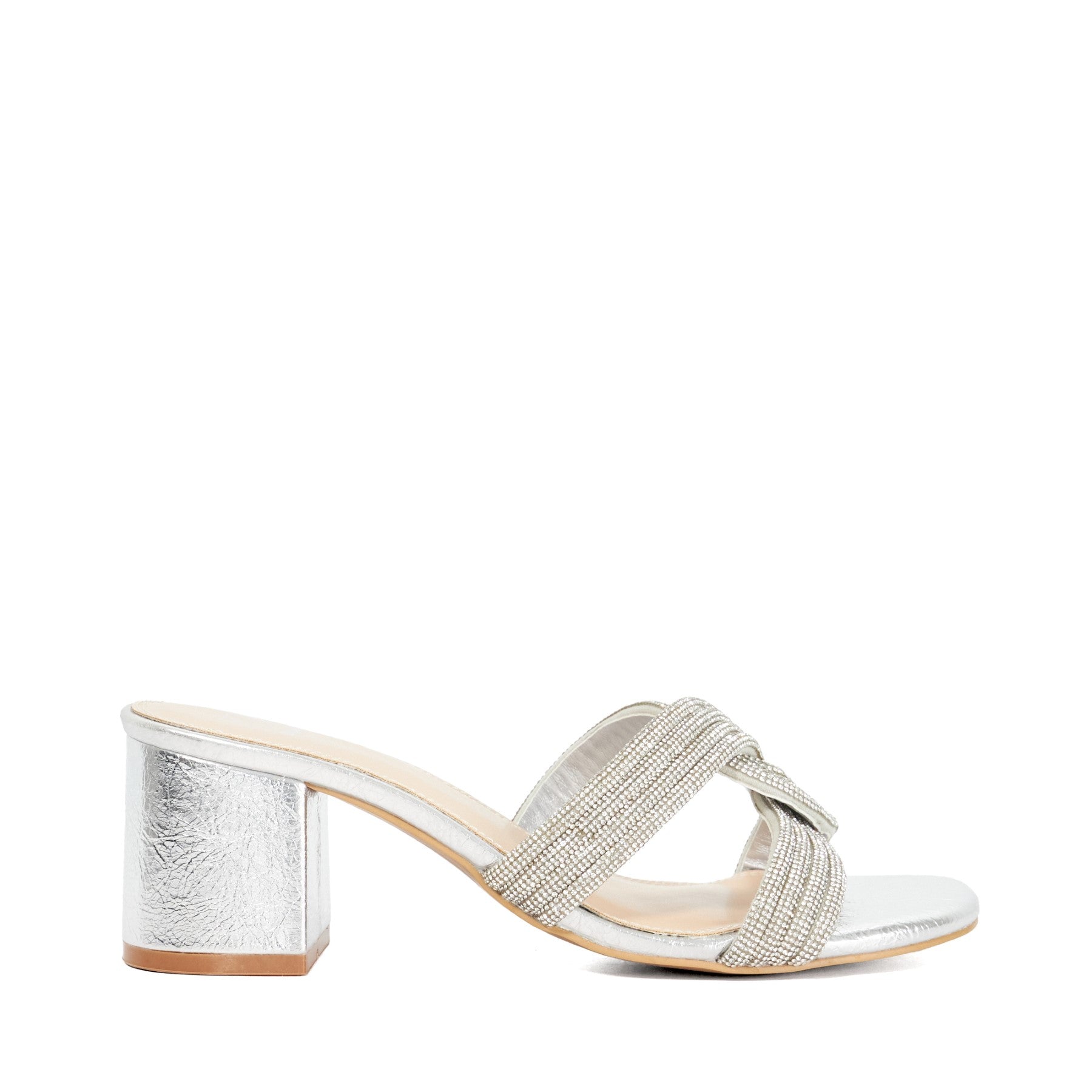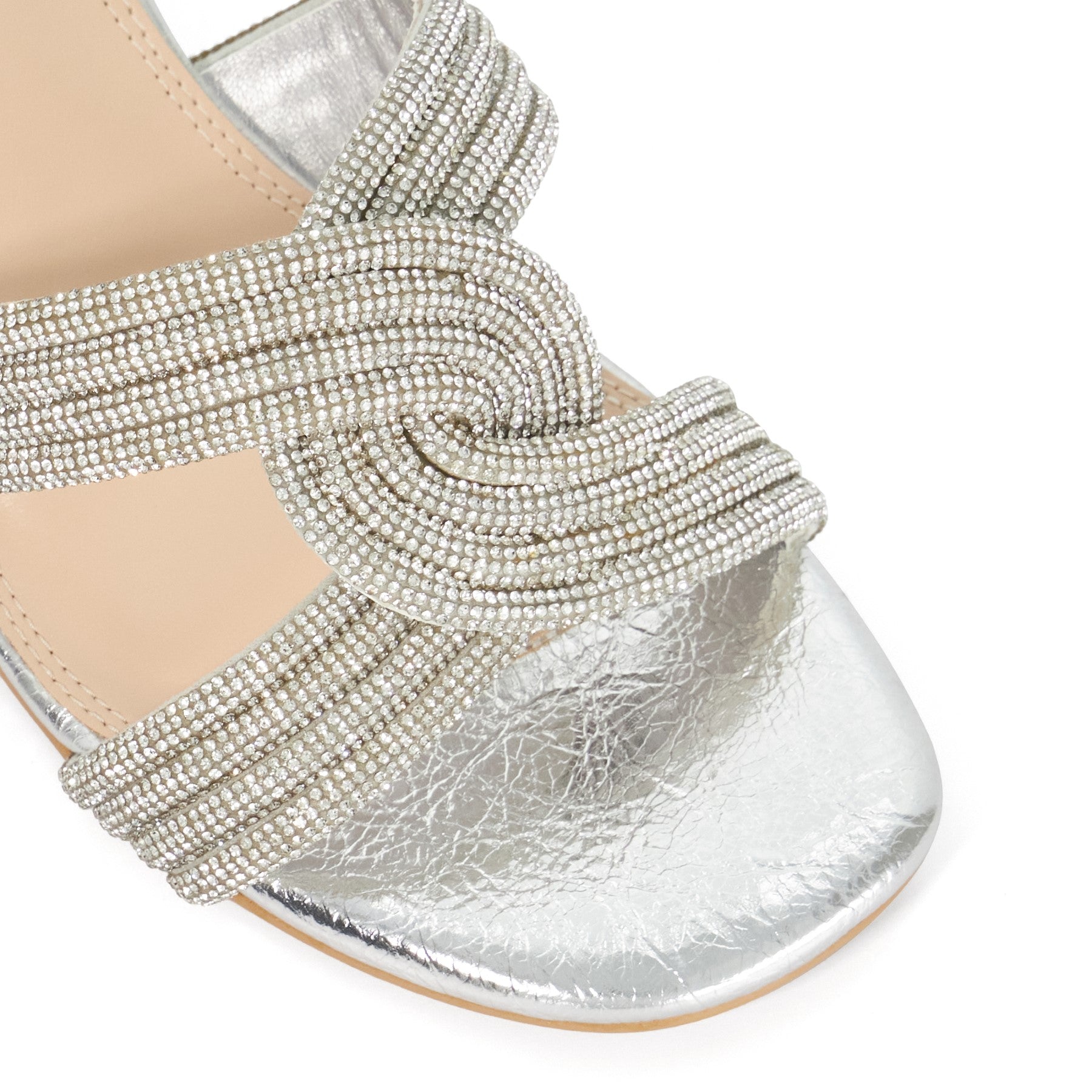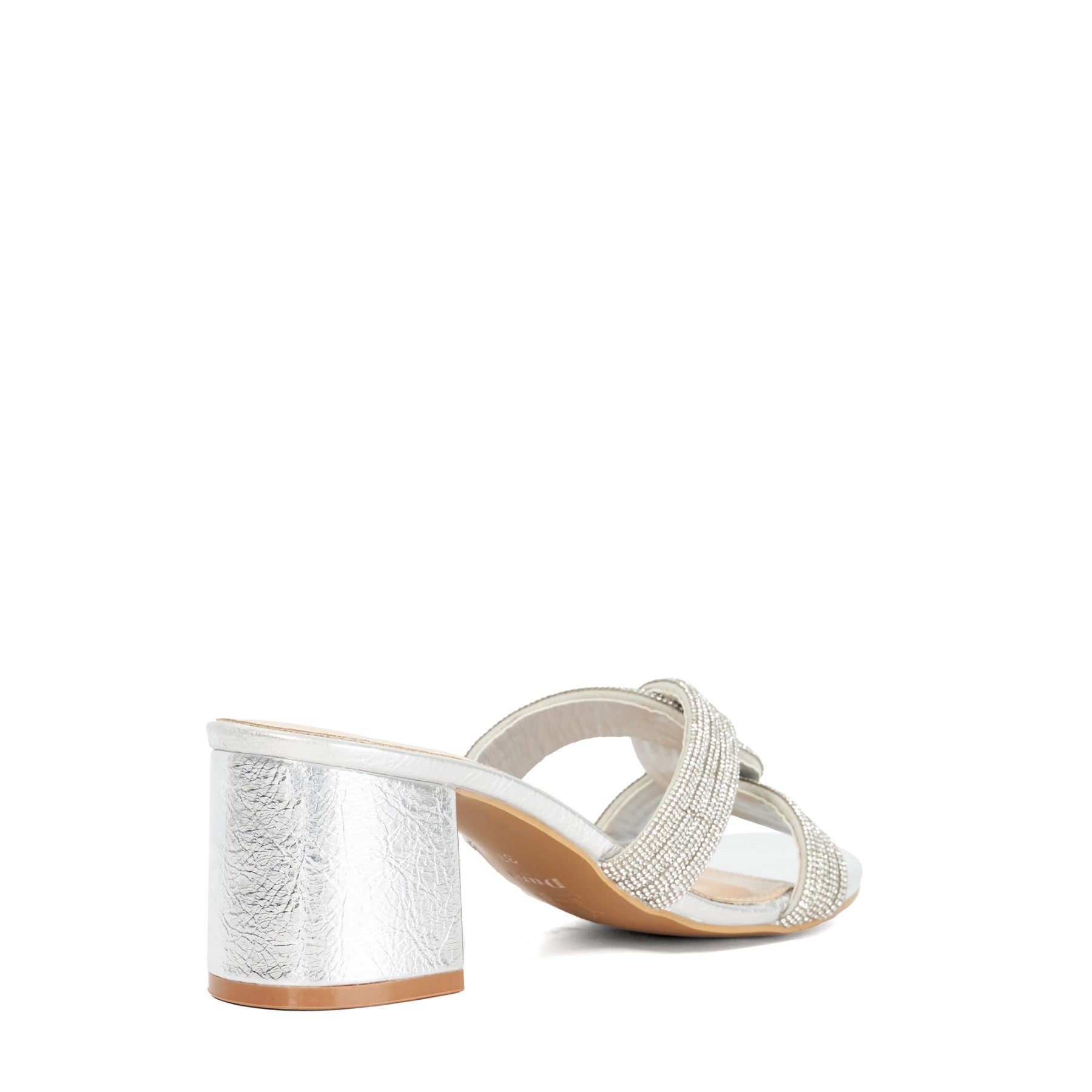 This elegant slip on sandal profile features two interlocking embellished front straps. Resting on a comfortable low block metallic heel this timeless sandal will take you from day through to evening.