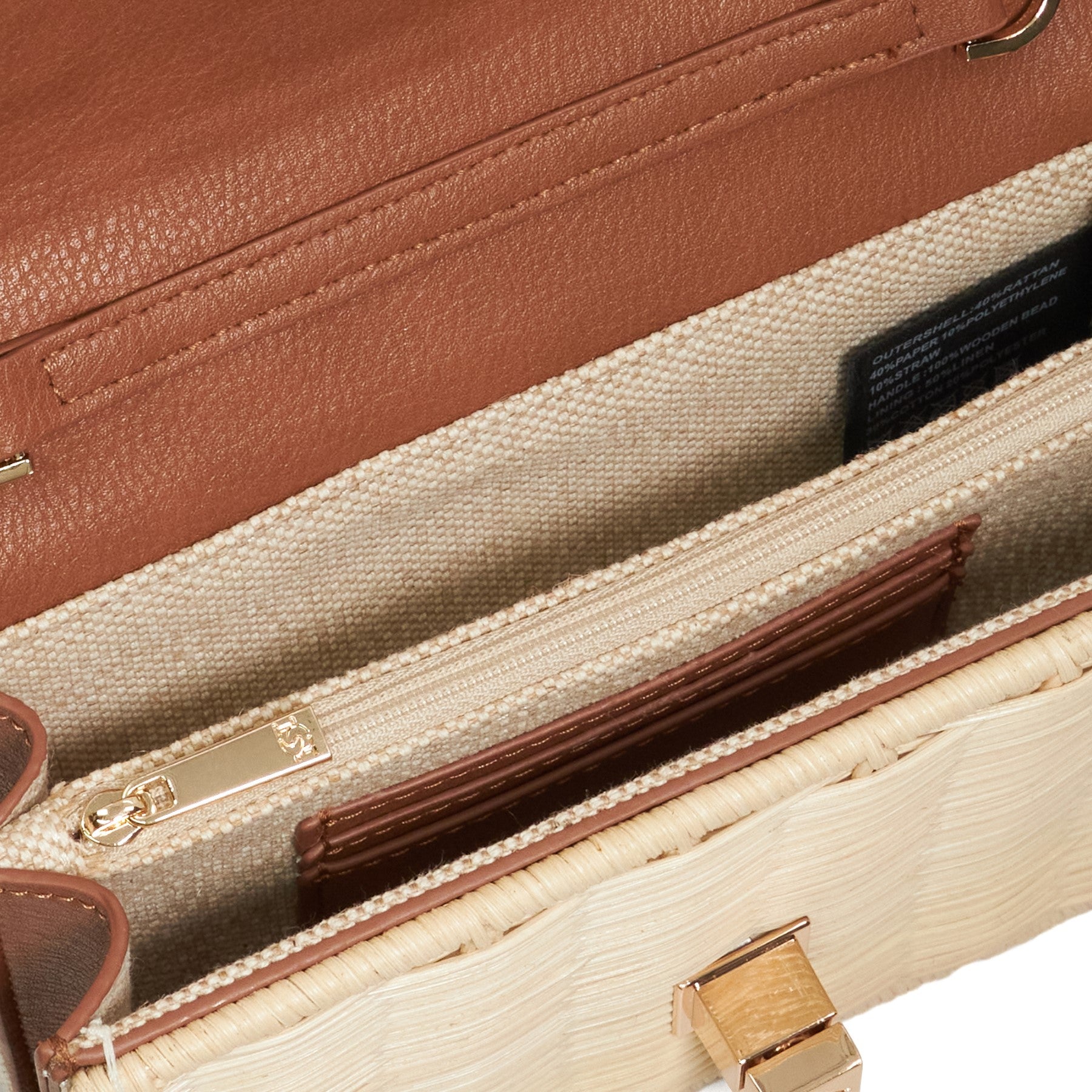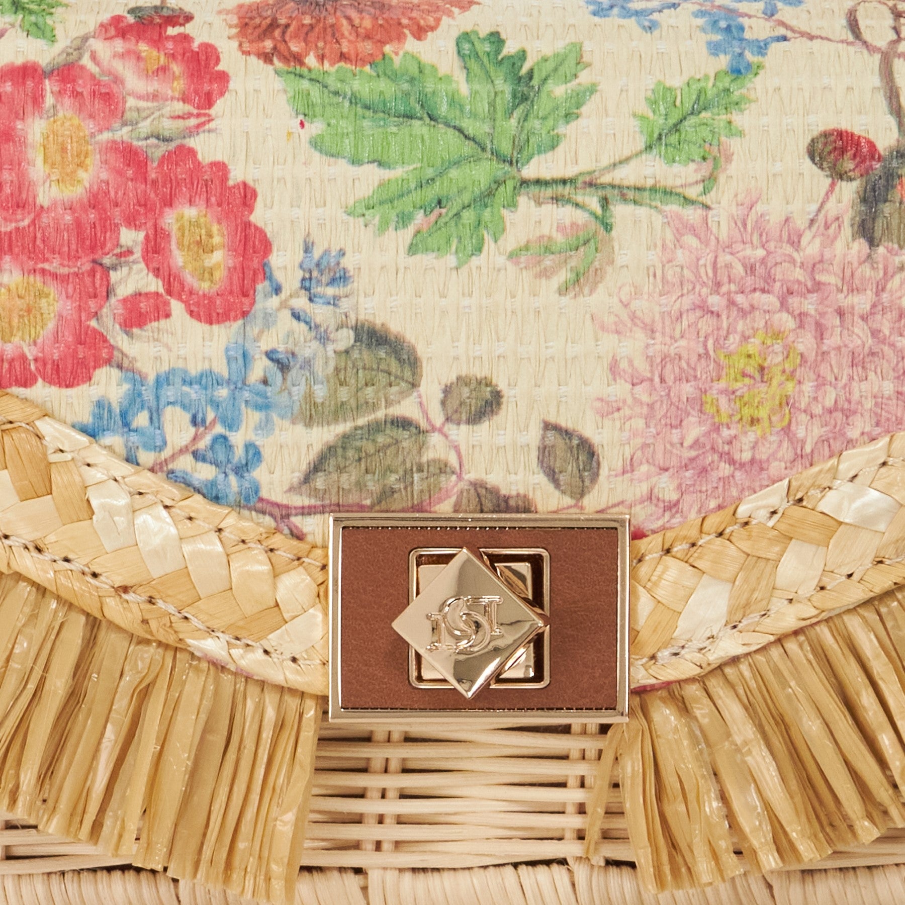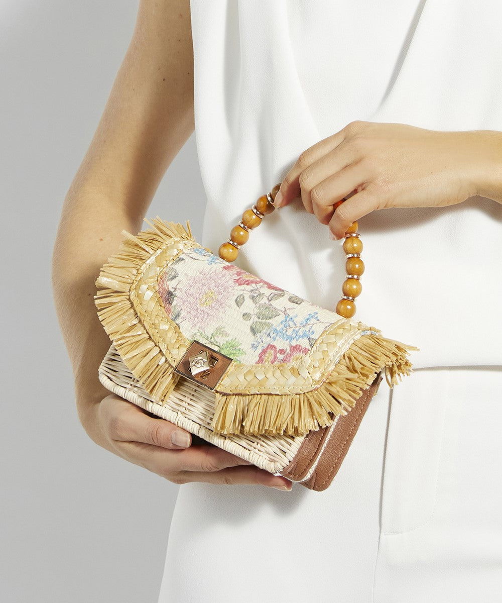 Update your summer style with Blooms. Available in boucle and denim this foldover profile features sparkling jewel embellished flowers and our signature turn lock closure. This woven style features a removable cross body strap and a striking beaded top handle offers the final touch of distinction.