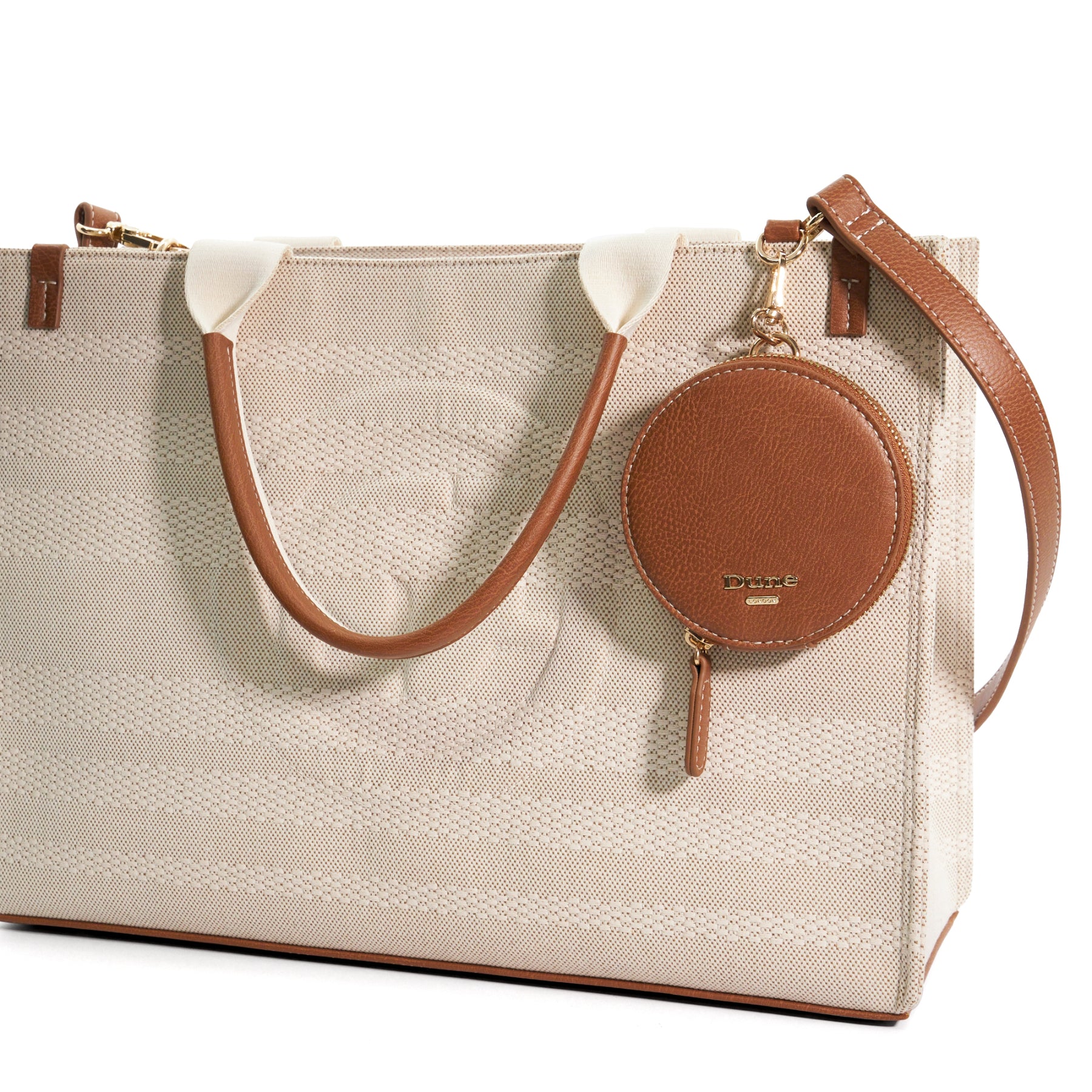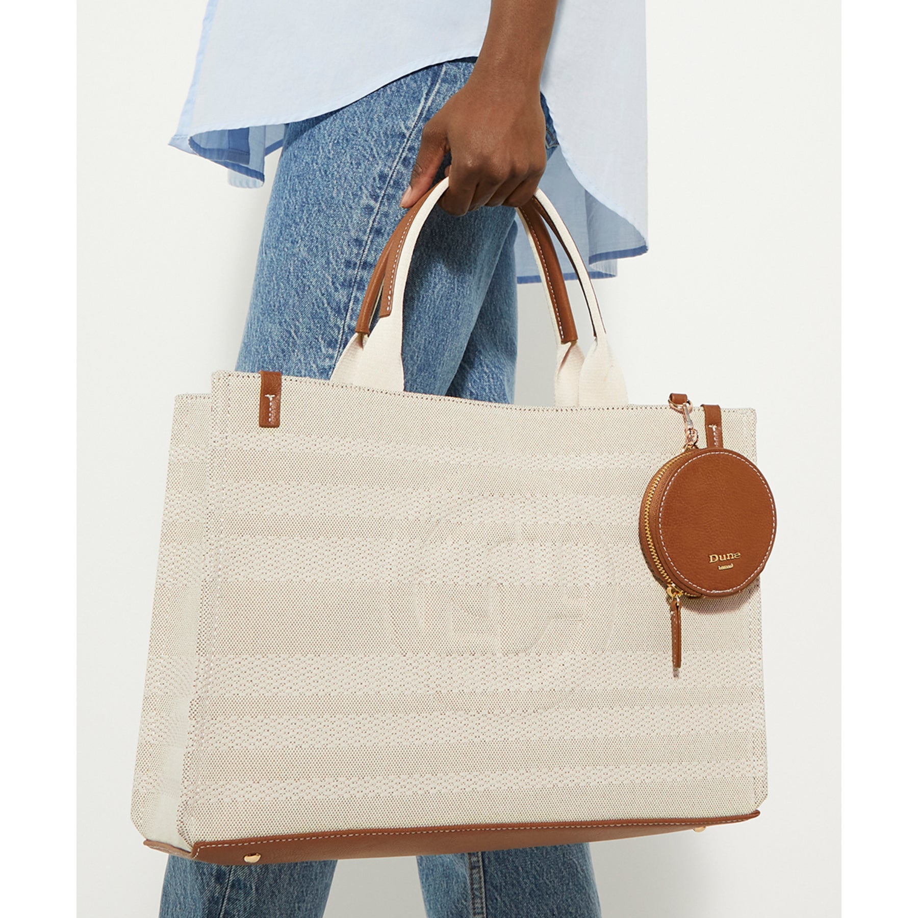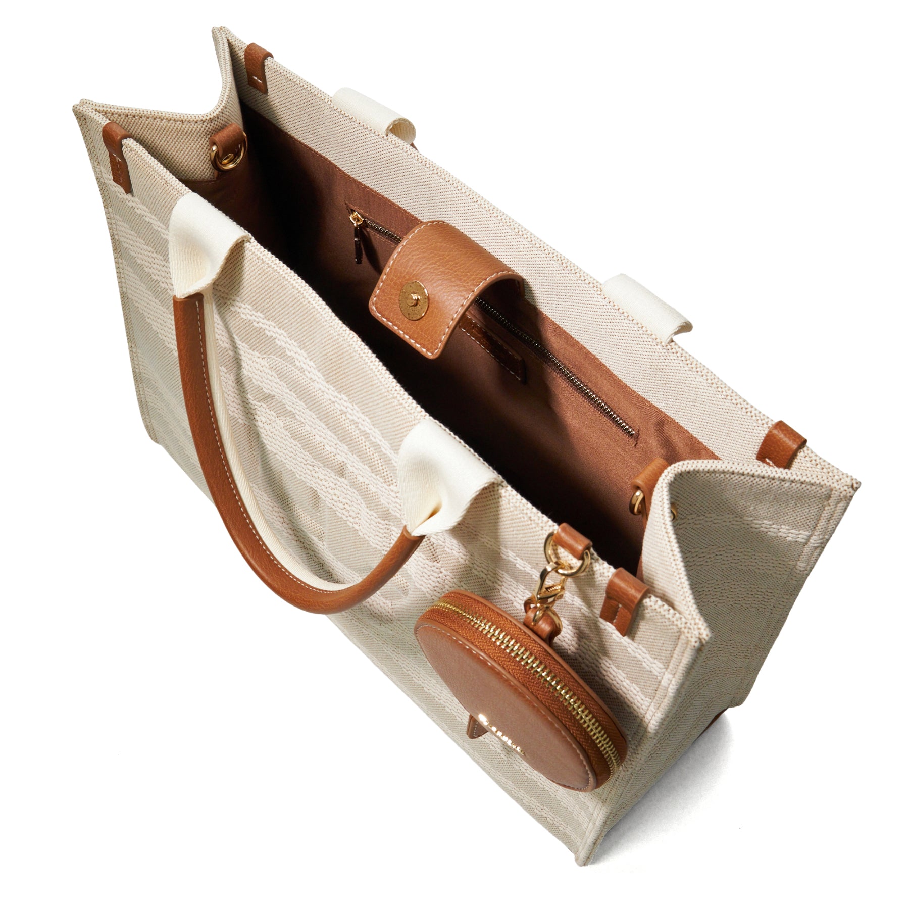 A tote bag is an iconic staple style. Elevate your warm-weather ensembles with Deltra. Featuring a trimmed top handles and a removable strap for ease of wear this signature silhouette boasts a stripy motif and a detachable coin purse for organised storage and our bespoke embossing that's certain to take your holiday edit to the next level. Finished with a secure magnetic closure Deltra will become the focal point of your warm-weather ensembles.